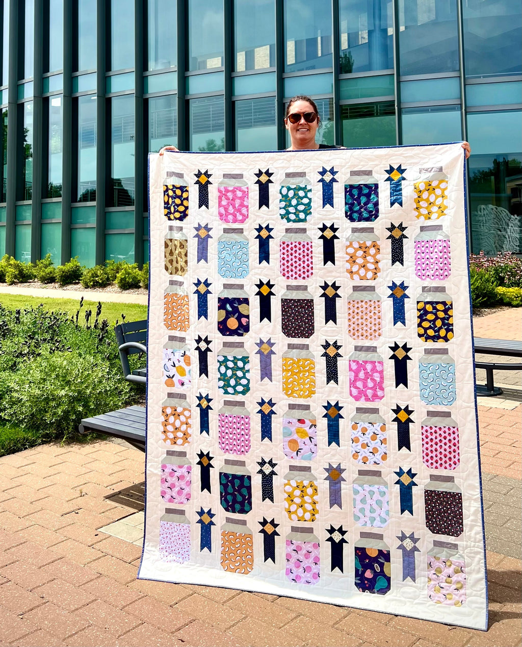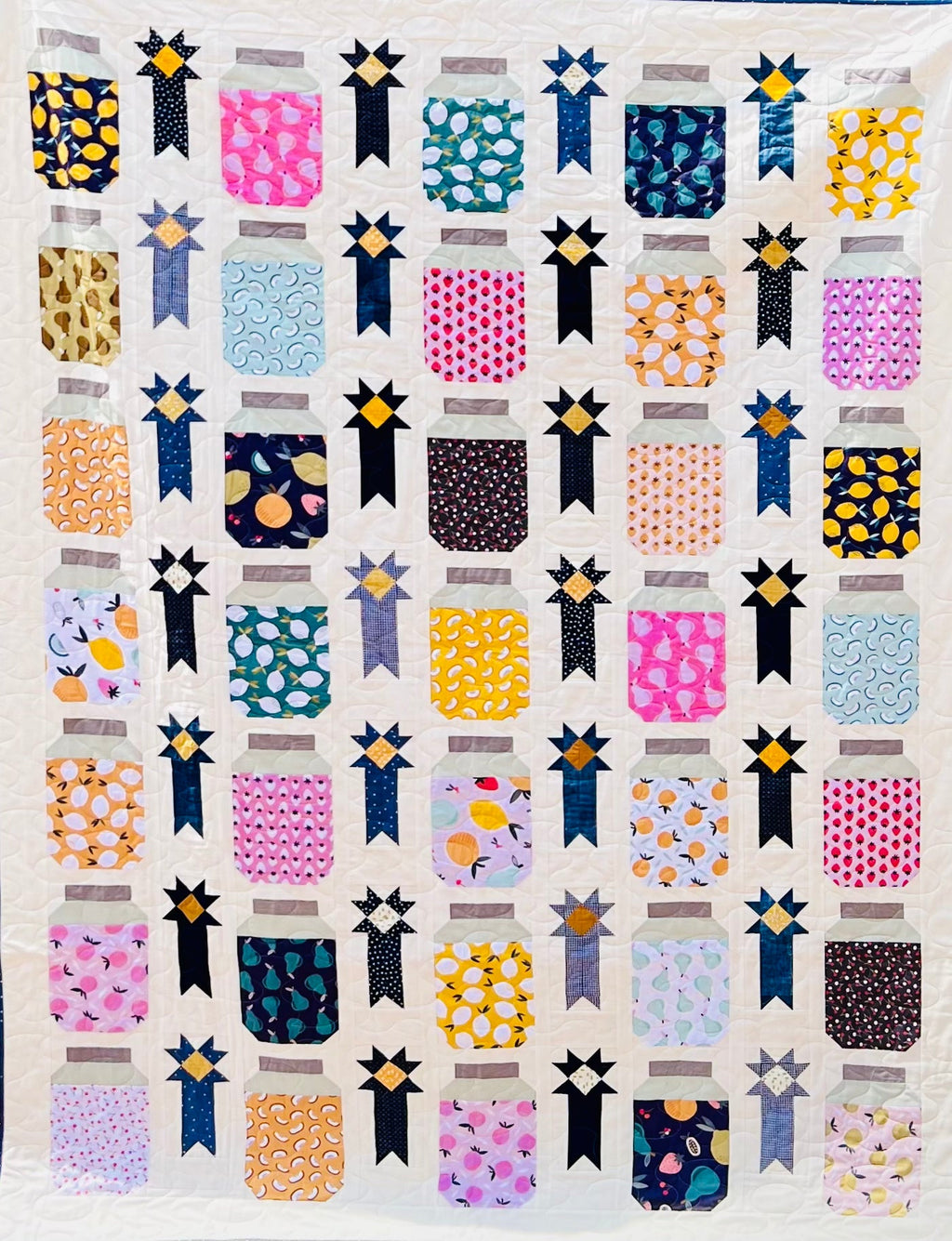 I designed this quilt pattern after I fell in love with some fruit fabric I saw, but didn't know what to do with it! So like any good country girl, I filled up canning jars with it! This quilt is so much fun and has loads of personality. The pattern is easy to follow with picture tutorials for each block assembly step.
