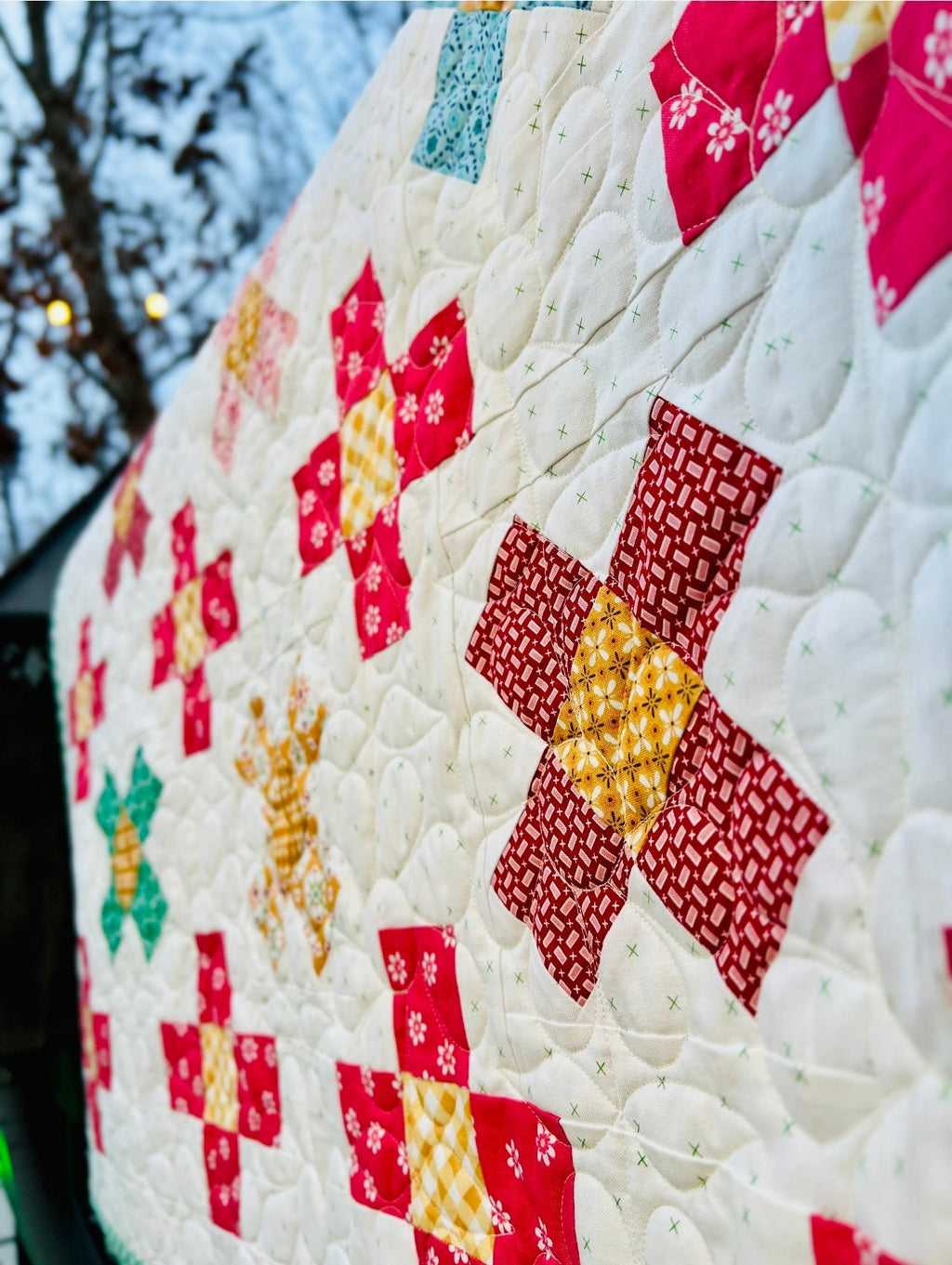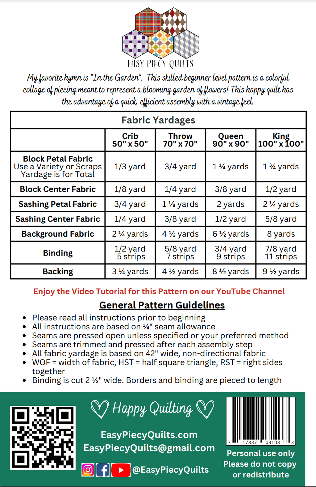 My favorite hymn is “In the Garden”. This skilled beginner level pattern is a colorful collage of piecing meant to represent a blooming garden of flowers! This happy quilt has the advantage of a quick, efficient assembly with a vintage feel.