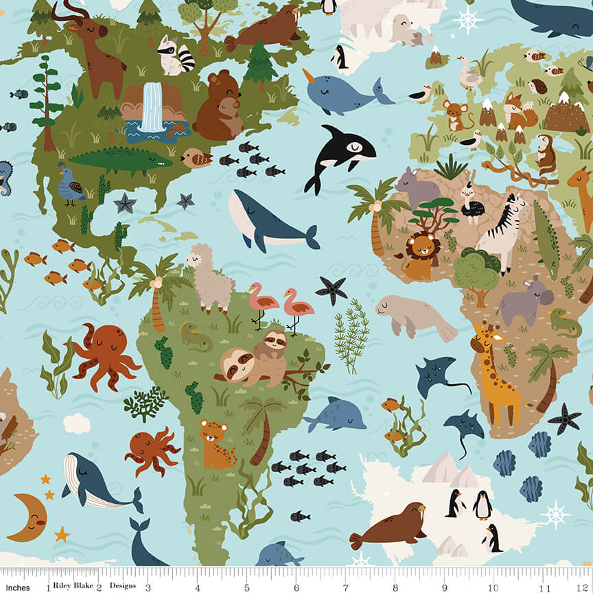 Created with Love by Jennifer Long of Sew A Story for Riley Blake Designs is great for quilting, apparel and home decor. This print features a map with continents and animals.