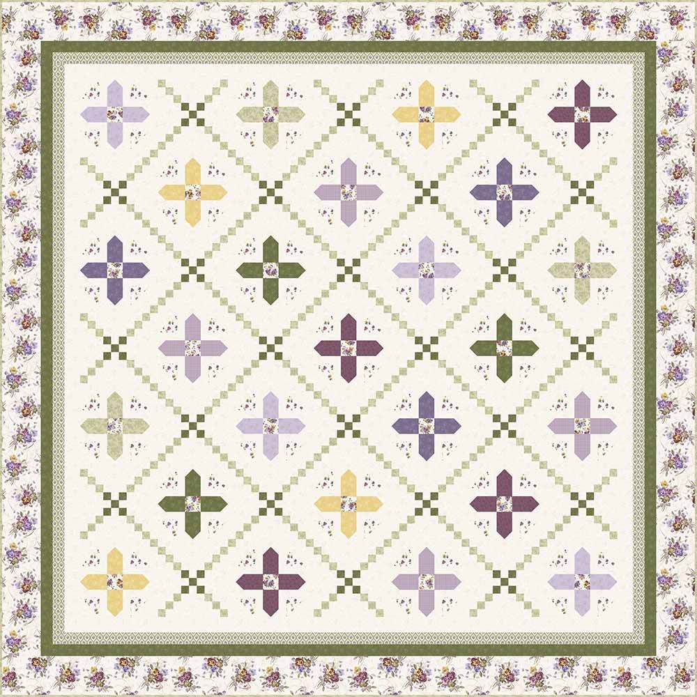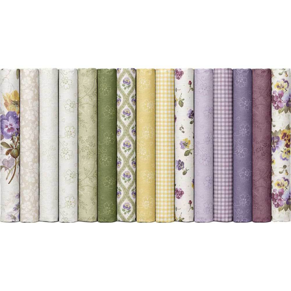 Marcus Fabrics drew inspiration from the archives of the Smithsonian Institution to create the Dandy Pansies collection. Based on an 18th century French Wallpaper, the beautiful pansy blooms are executed with artistic detail and colored in shades of purple, pink, green, cream and a bit of yellow. Kit includes pattern from Marcus and all the Dandy Pansies fabrics for the top and binding of an 89" x 89" quilt. Backing available separately, 8 yards of a 44" or 3 yards of a 108" are recommended.