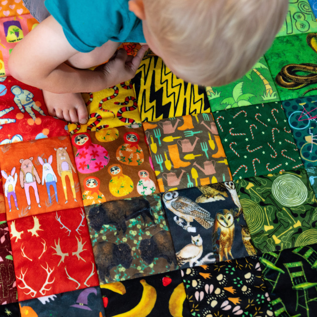 Pre-printed I spy quilt panel features over 200 images that are made to seek and find. Every part of this is hand drawn and is a Block Party custom print. The best part? It's printed on minky. Now you have a super soft, crazy fun, and extremely simple project to make.