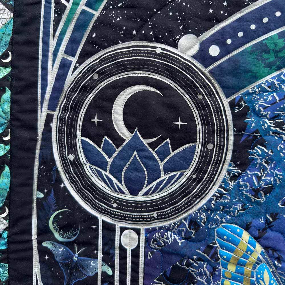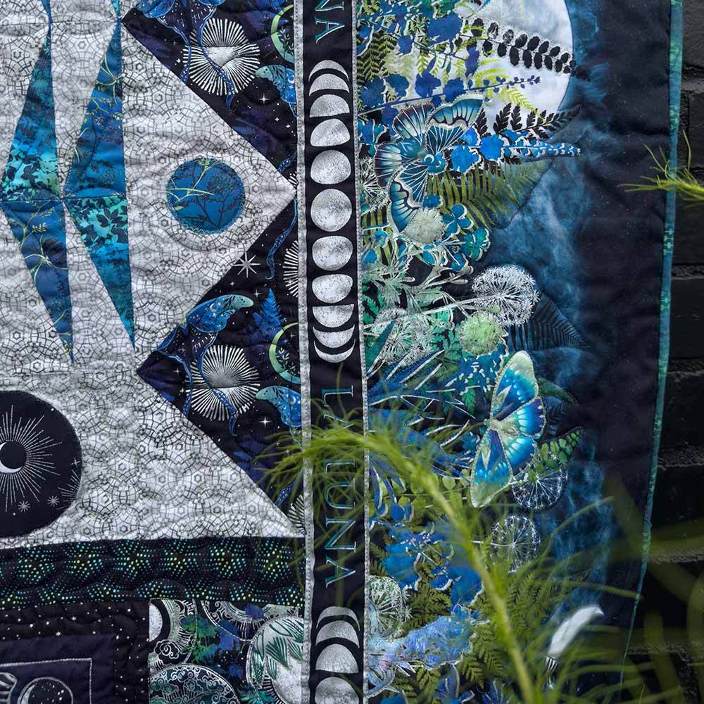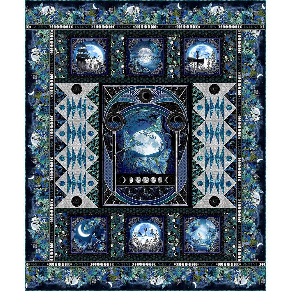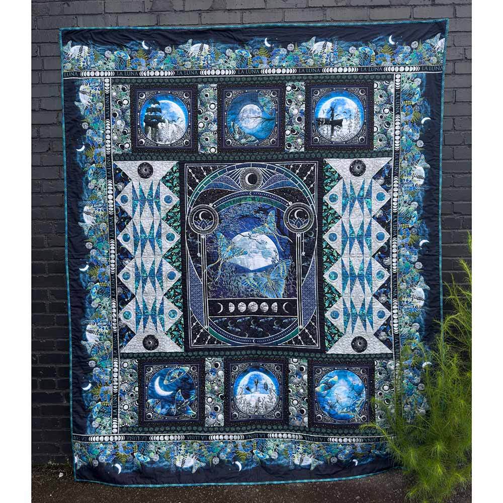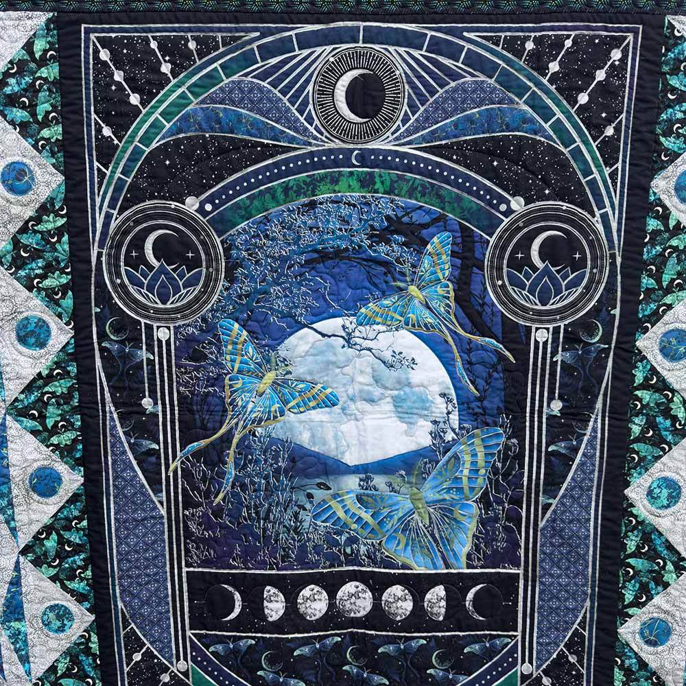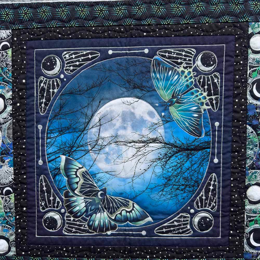 By the light of the moon, nature reveals its quiet magic—glowing wings of luna moths, whispering leaves and wildflowers, and wonders only night can show. The La Luna Kit includes pattern by Jason Yenter and all the fabrics needed, including panels, for the top and binding from the La Luna metallic collection. Finished size is 77" x 93". Backing available separately, 8 yards x 44" wide recommended.