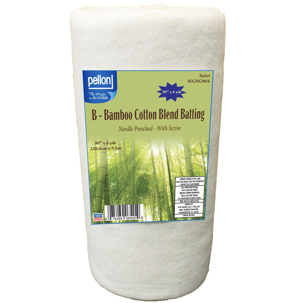 Pellon® Bamboo/Cotton Batting Scrim 90" x 6 Yards. This batting is needle punched with a soft scrim that lends strength and stability without bunching or bearding.The loft is 1/16 of an inch with a shrinkage of 3-5%. Recommended maximum stitch distance is 10" apart. Washable by hand or machine and dry cleanable. Fiber content is 47% Rayon Fiber made from Bamboo / 46% Cotton / 7% Polypropylene Scrim.