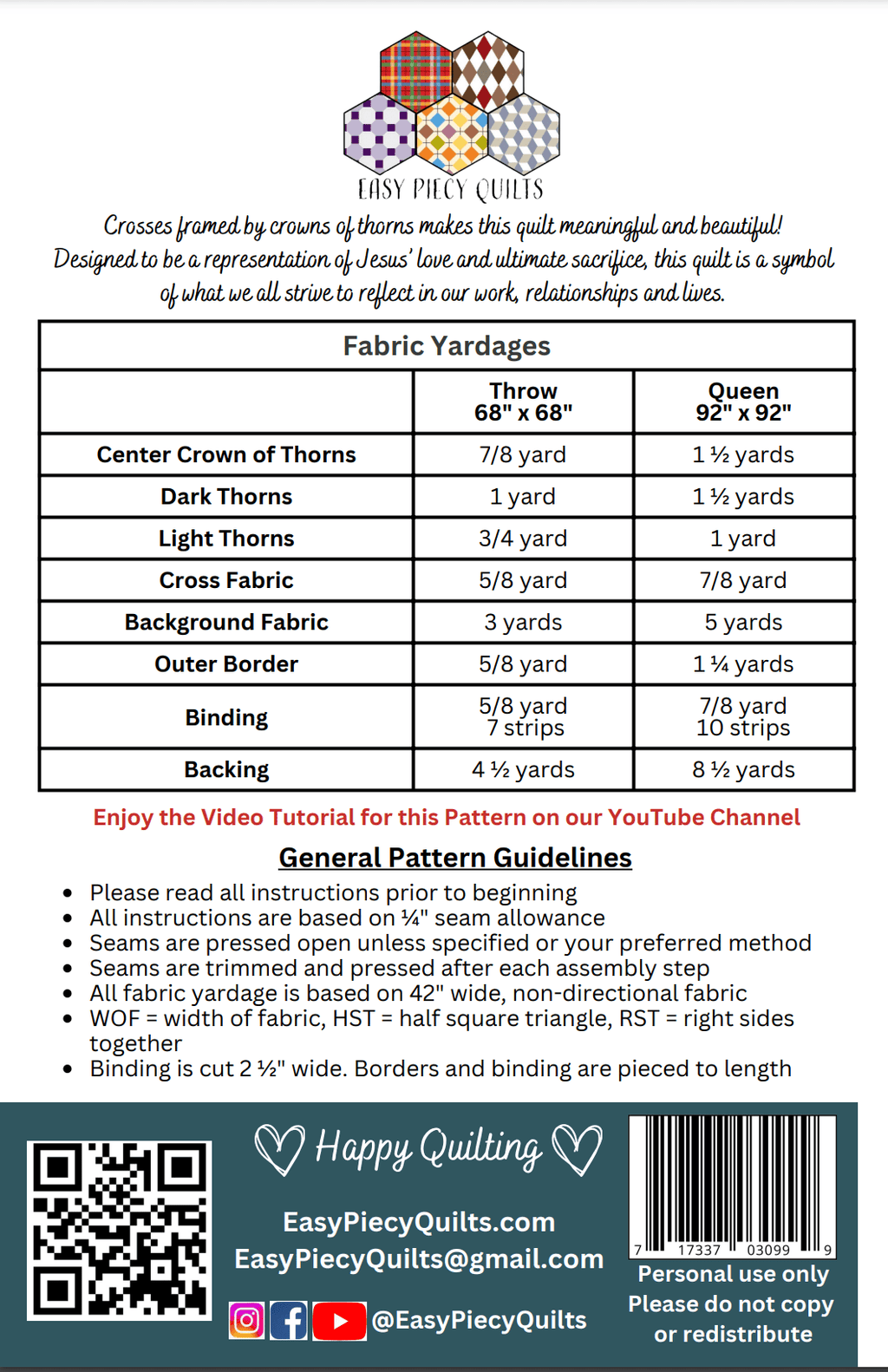 Traditionally pieced quilt with no Y or partial seams, this pattern features the crown of thorns quilt block. Crosses framed by crowns of thorns makes this quilt meaningful and beautiful! Designed to be a representation of Jesus' love and ultimate sacrifice, this quilt is a symbol of what we all strive to reflect in our work, relationships and lives.
