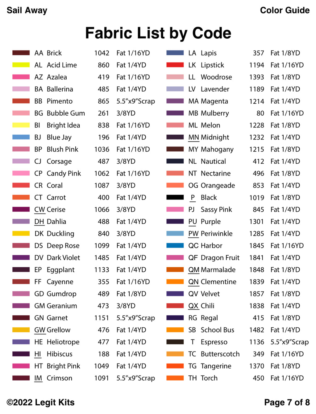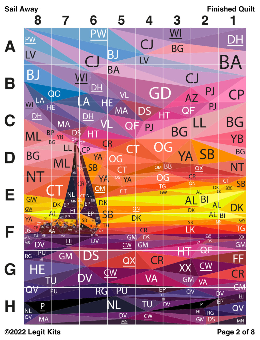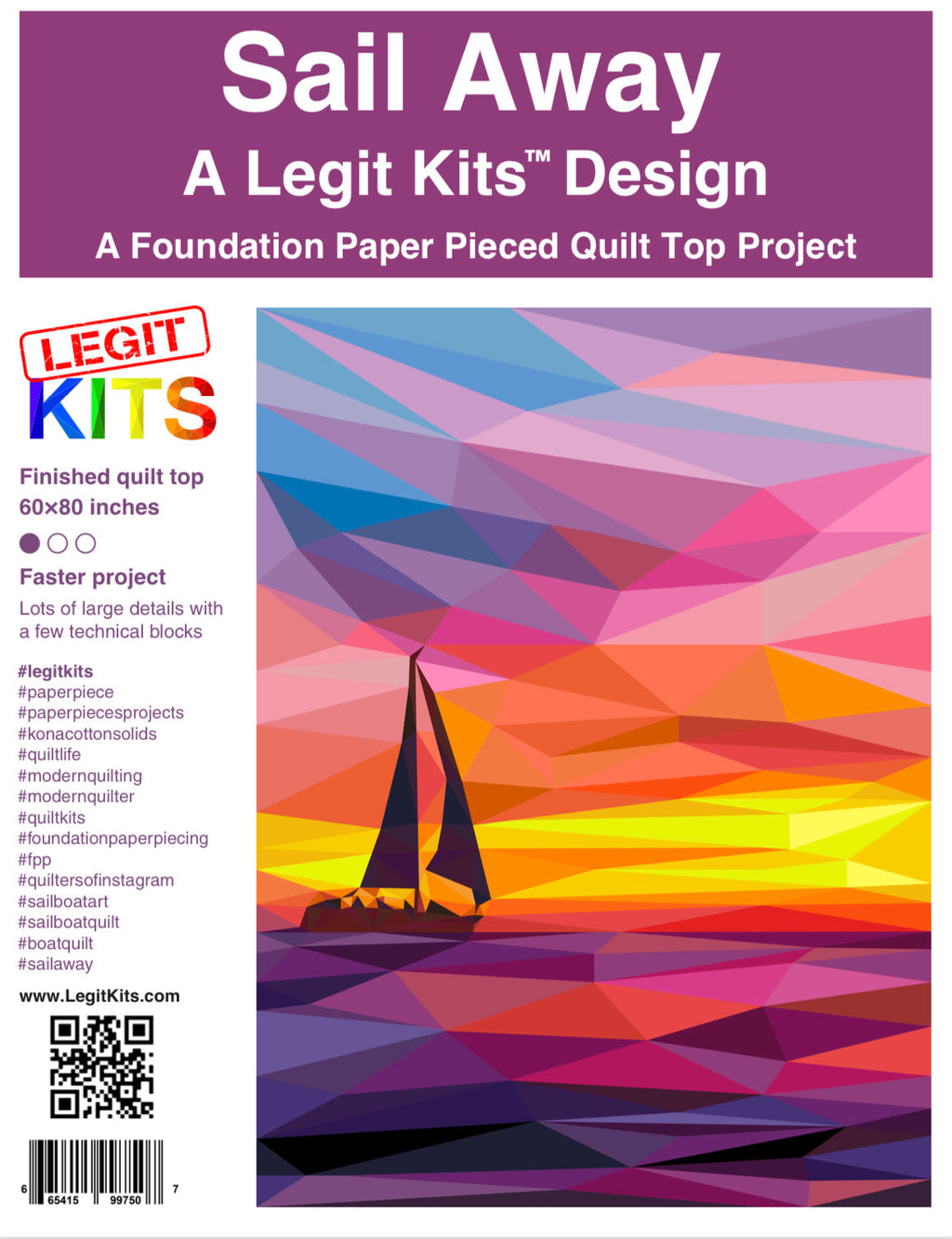 Cast off the dock lines and steady your course. Sail Away depicts a perfect cruise with vivid colors. This printed pattern contains color maps, fabric lists, an assembly guide, the full pattern printed on foundation paper, and the fabric list of all 63 shades of Robert Kaufman Kona Cotton Solids required to complete this full sized, 60 inch wide by 80 inch tall quilt top.