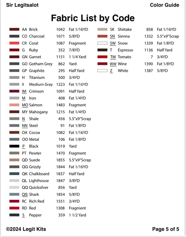 Sir Legitsalot brings to mind King Arthur and saving princesses. But these days he is on the quest for the dragon that has been terrorizing the quilters of North Full Bobbinhamshire. This design is created with 35 Kona Cotton colors in rich reds and shades of grey to give his armor depth and movement. This is the perfect statement piece for history buffs and gamers or as a companion piece to Toasty the Dragon. Don't let Sir Legitsalot go on quests without you!