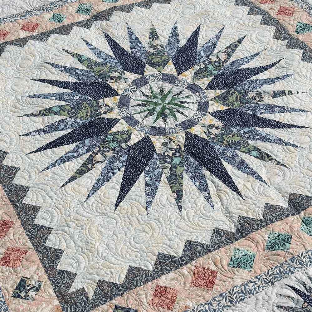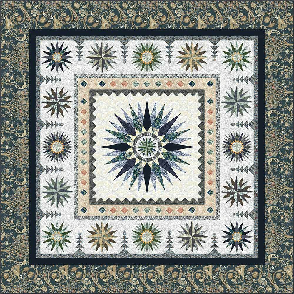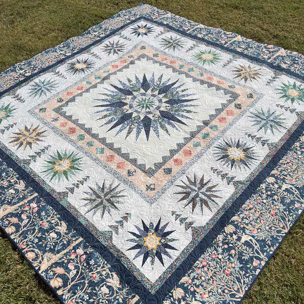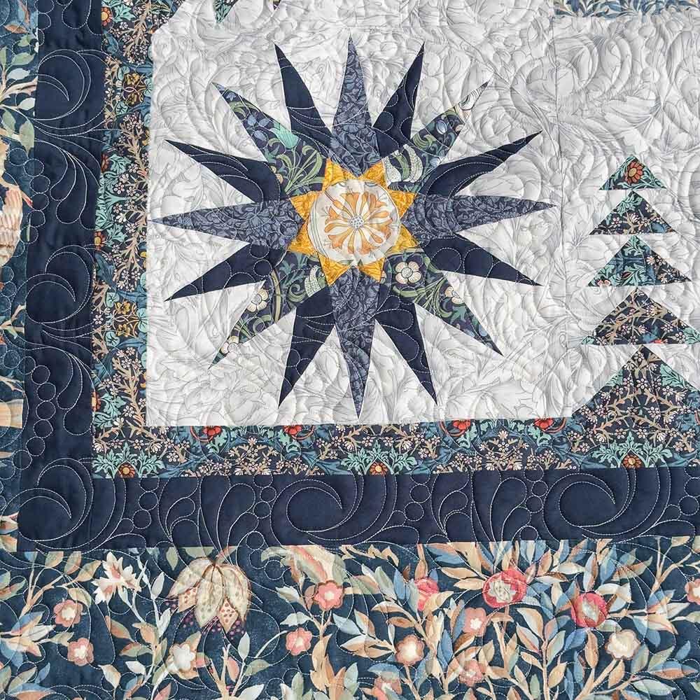 The Starlit Voyage quilt features a striking Mariner’s Compass at its center, creating a bold, navigational theme that evokes adventure and precision. The meticulously crafted compass points extend outward like guiding stars, complemented by surrounding starburst elements that enhance the overall symmetry and movement. Richly contrasting colors and a thoughtfully designed border frame the piece, making the compass a true focal point of exploration and artistry. This pattern is a testament to both craftsmanship and direction. Kit includes the full pattern set by Linda McGibbon and all the fabrics needed for the top and binding from The Original Morris & Company collection by William Morris for FreeSpirit. Finished size of this foundation paper pieced king project is 104" x 104". Available separately we have a 27-piece fat quarter pack that matches back perfectly to this project and would be great to have on hand in case of any miscuts. Backing is also available separately, 9 yards x 44" wide or 3-1/2 yards x 118" wide is recommended.