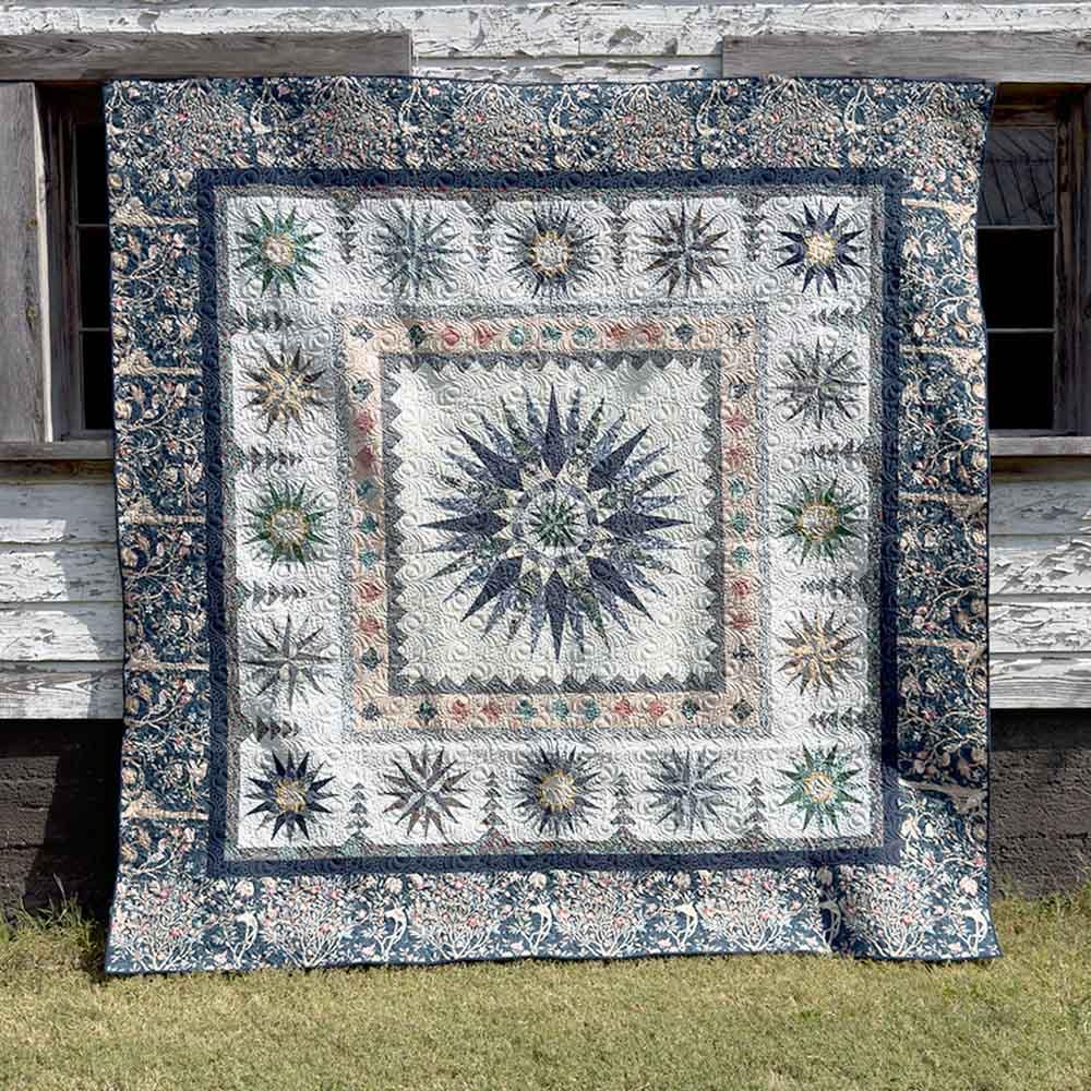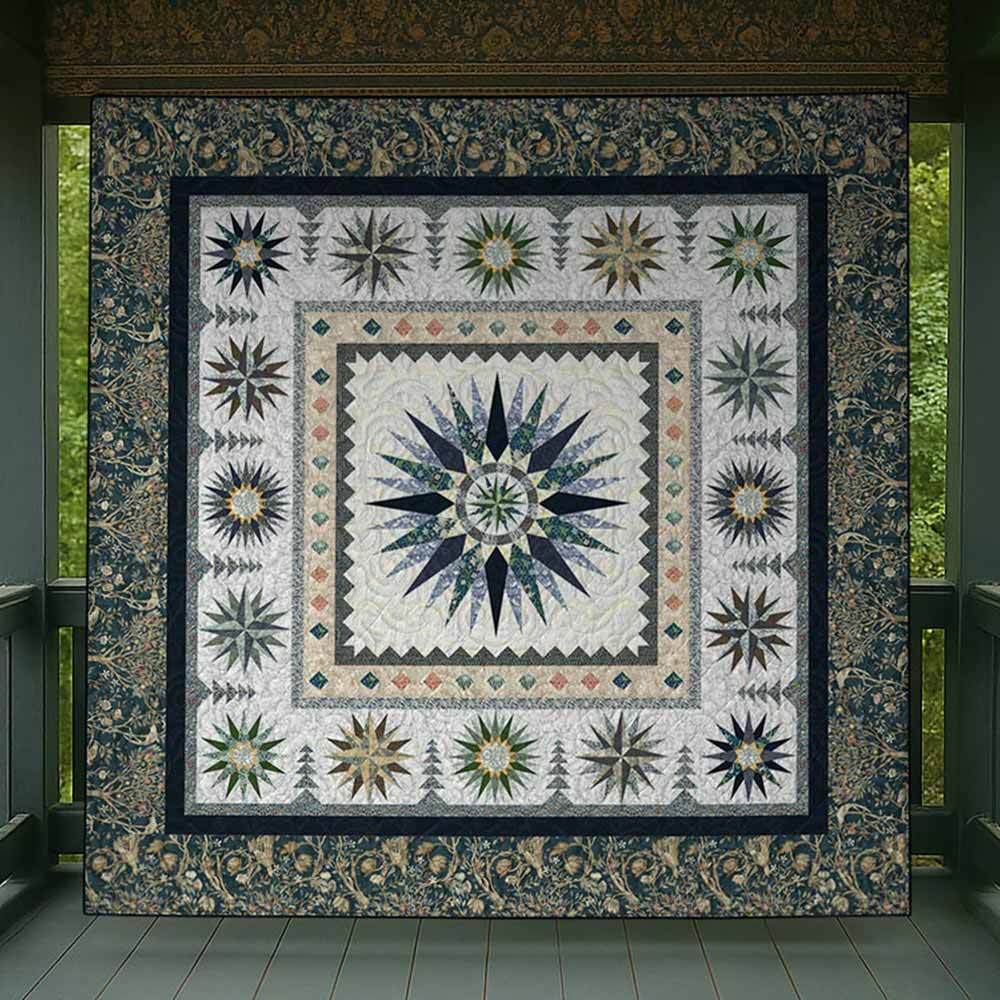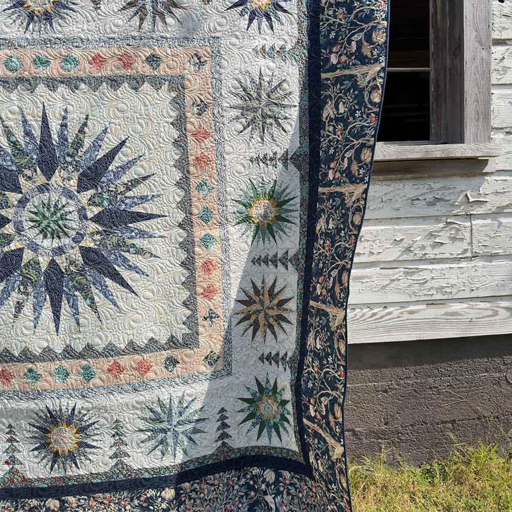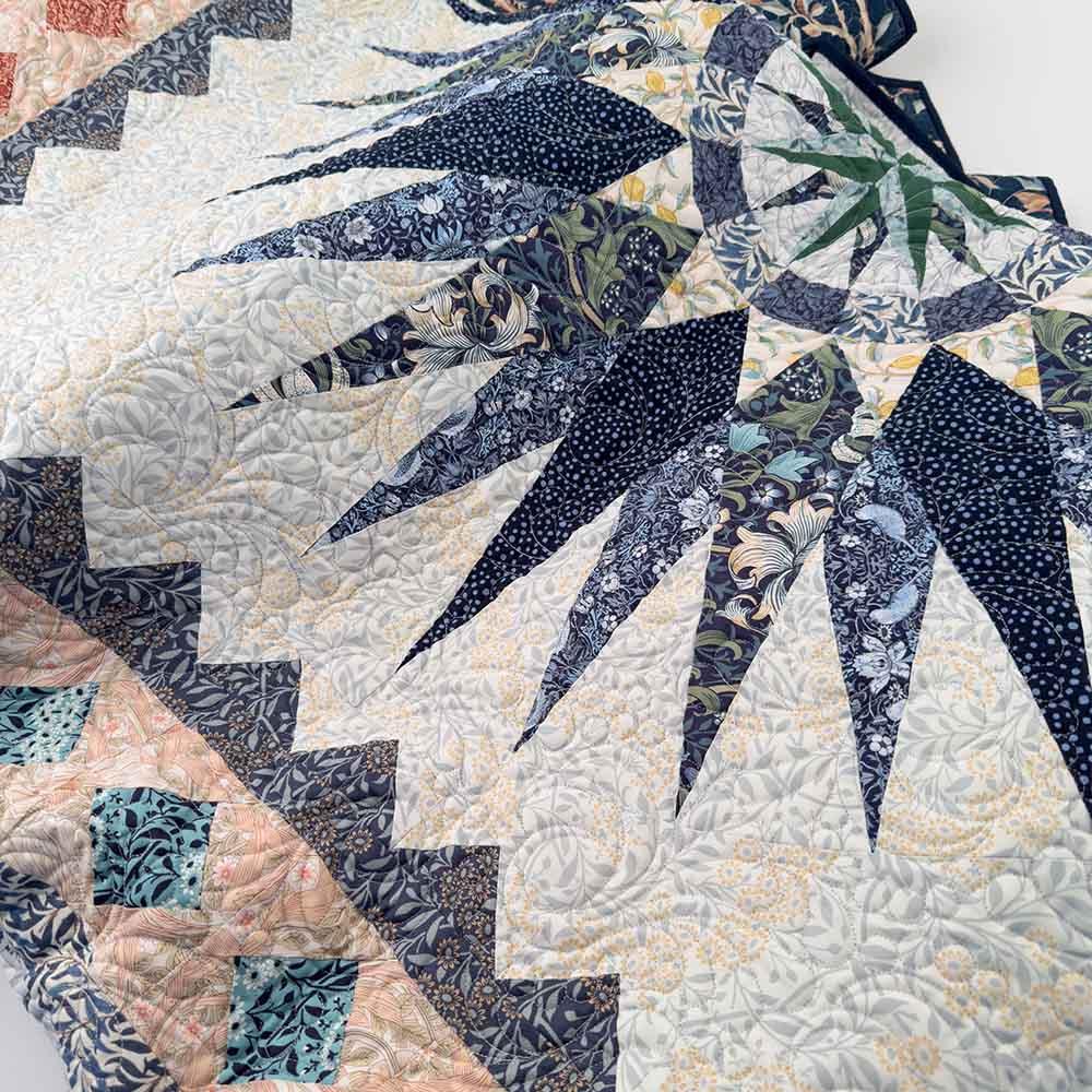 The Starlit Voyage quilt features a striking Mariner’s Compass at its center, creating a bold, navigational theme that evokes adventure and precision. The meticulously crafted compass points extend outward like guiding stars, complemented by surrounding starburst elements that enhance the overall symmetry and movement. Richly contrasting colors and a thoughtfully designed border frame the piece, making the compass a true focal point of exploration and artistry. This pattern is a testament to both craftsmanship and direction. Kit includes the full pattern set by Linda McGibbon and all the fabrics needed for the top and binding from The Original Morris & Company collection by William Morris for FreeSpirit. Finished size of this foundation paper pieced king project is 104" x 104". Available separately we have a 27-piece fat quarter pack that matches back perfectly to this project and would be great to have on hand in case of any miscuts. Backing is also available separately, 9 yards x 44" wide or 3-1/2 yards x 118" wide is recommended.