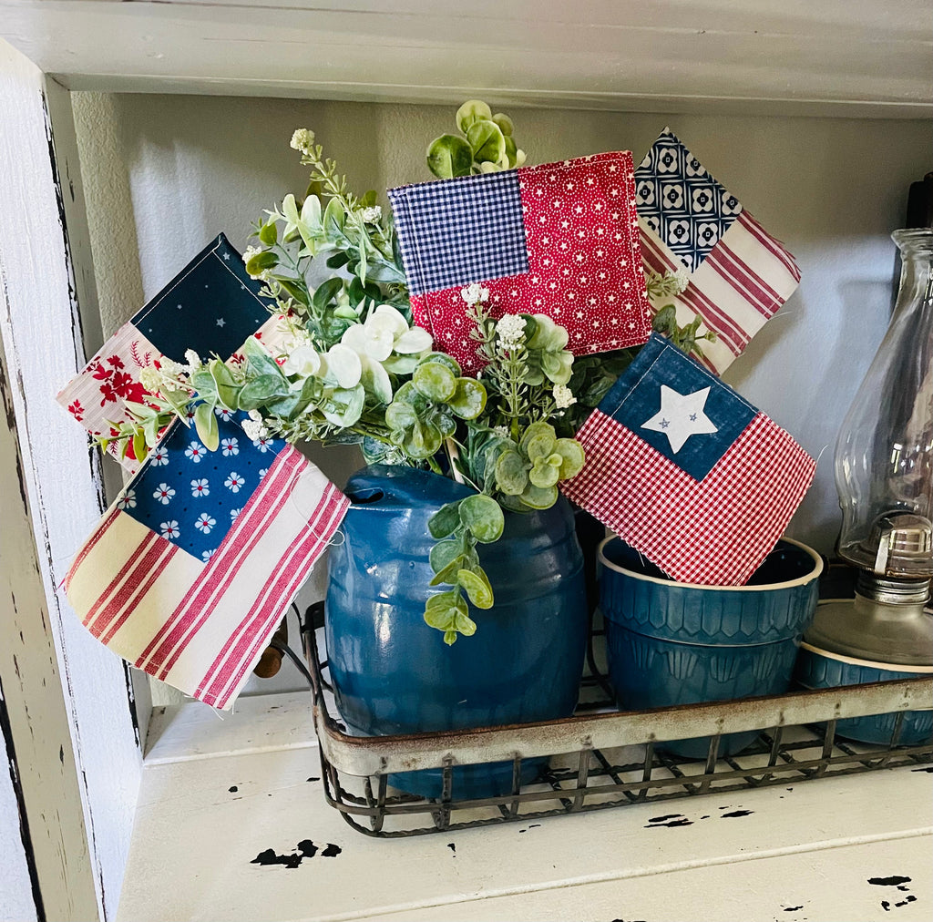 These adorable little flags look fabulous tucked in places around your home for summer. They are so fun and easy to make, put them in gifts or decorate the porch.