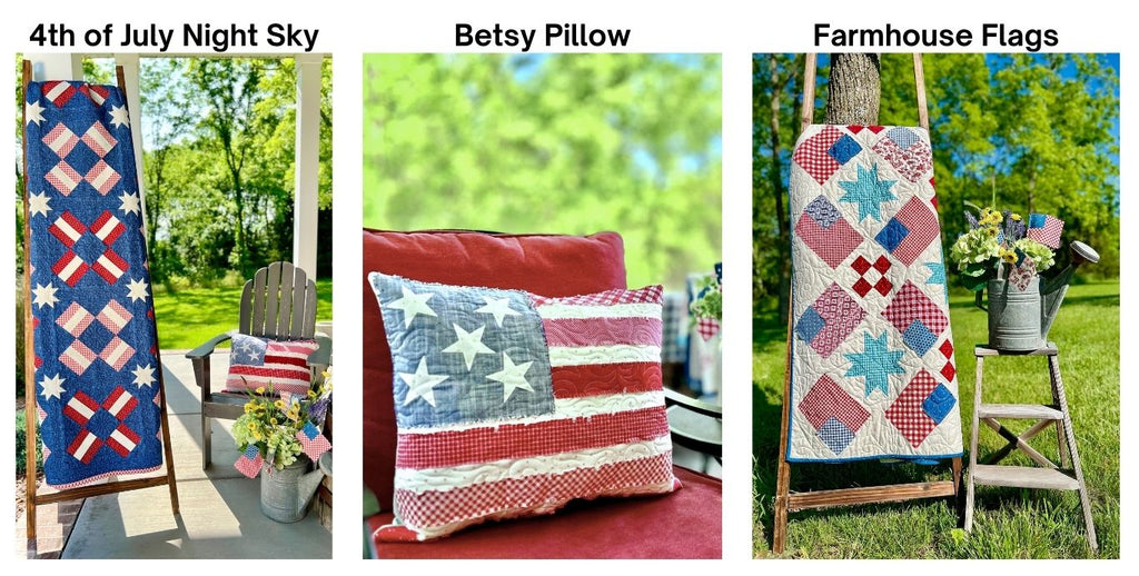 4th of July Night Sky Quilt Pattern, Betsy Quilted Pillow Pattern and Farmhouse Flags Quilt Pattern included.