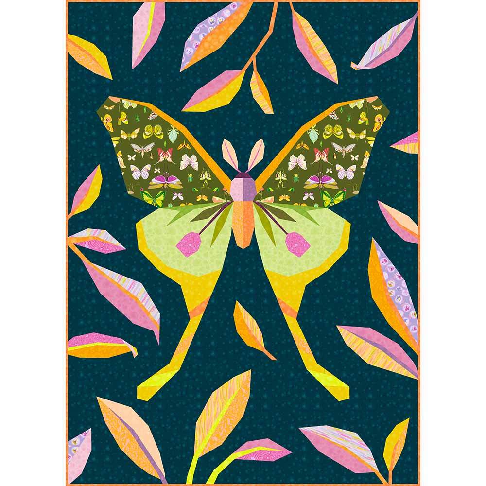 The Luna Moth Kit includes pattern with instructions by Tamara Kate for foundation paper piecing and all the fabrics needed for the top and binding of a 40" x 55" finished quilt. Backing available separately, 2 yards x 44" wide is recommended.