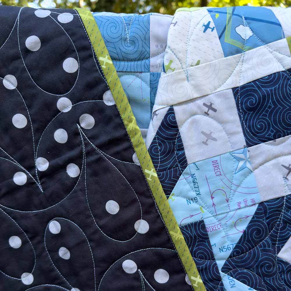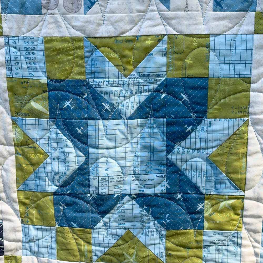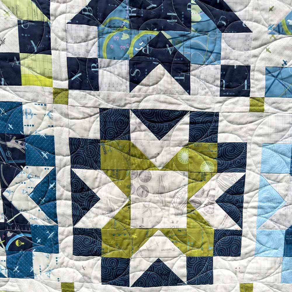 Drawing on the fabric designer's background in aviation, the collection featured evokes the language and imagery of flight: vintage airplanes, logbooks, aerodynamic diagrams, Morse code, swirling air currents, and topographic maps. The Waypoint Kit includes pattern by Sariditty and all the fabrics needed, including a 26-piece fat quarter bundle for the top and binding from the High Flight collection by Sarah Thomas of Sariditty. Finished size is 76" x 76". Backing is available separately, 4-1/2 yards x 44" wide recommended.